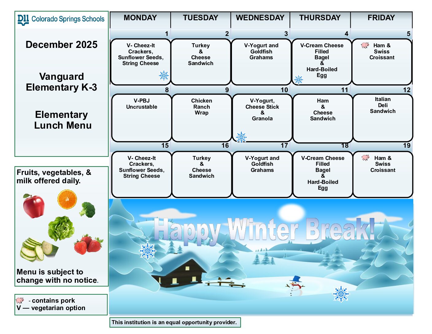 A lunch program is offered to students in grades K-12 at The Vanguard School. Colorado Springs School District 11, The Vanguard School’s lunch provider is participating in the Healthy School Meals for All program. All students enrolled in grades K-12 will receive lunch provided at no cost.